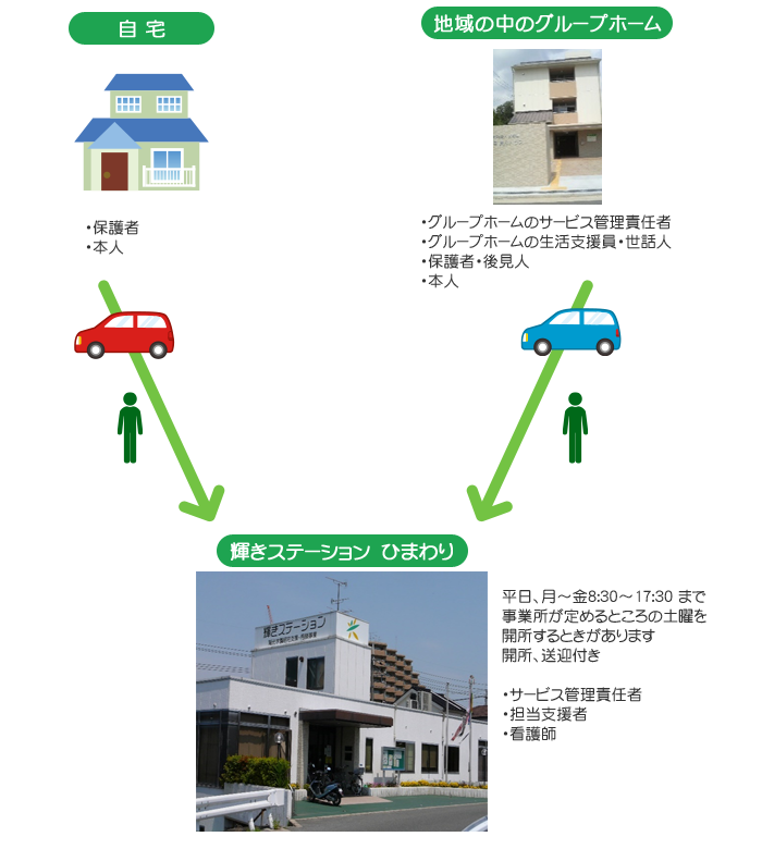 輝きステーションは、障害支援区分3以上の判定を受けている方(50歳以上は区分2以上)、生活介護、週○日と記されていればその日にちだけ、利用可能です。