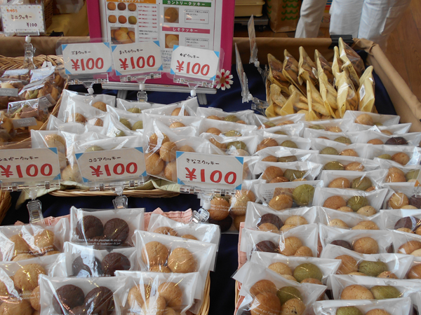 パン粉を使った生地をベースにした『ひまわりクッキー』、黒糖の素朴な味わいにクルミとレーズンを加えた『カントリークッキー』しそのさわやかさを生かした『しそクッキー』を作っています。計量、生地作り、焼きから包装までの工程です。